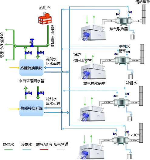 該項目采用雙良清潔能源集成系統(tǒng),在分析總結煙氣中水蒸汽冷凝率與排煙溫度的關系、冷凝率與熱效率的關系等研究結果的基礎上,采用雙良核心燃燒技術及超級冷凝技術,將鍋爐排煙溫度降至30℃以下,充分吸收利用煙氣中的顯熱和水蒸汽凝結過程中釋放的汽化潛熱,大幅提高燃氣利用率,降低供熱系統(tǒng)能耗,熱效率可達108%。